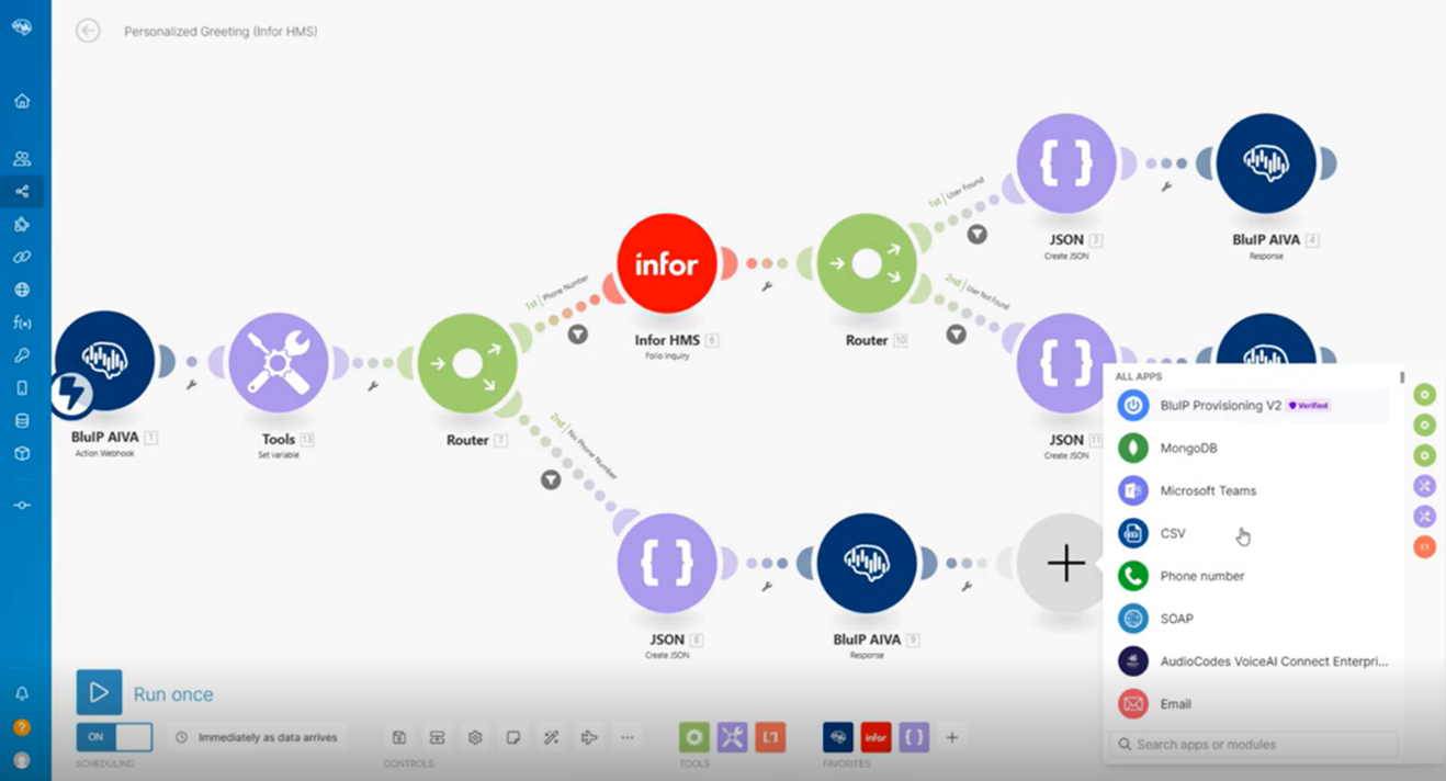 Workflow building in AIVA Connect Console (source: BluIP Analyst Briefing, 2025)