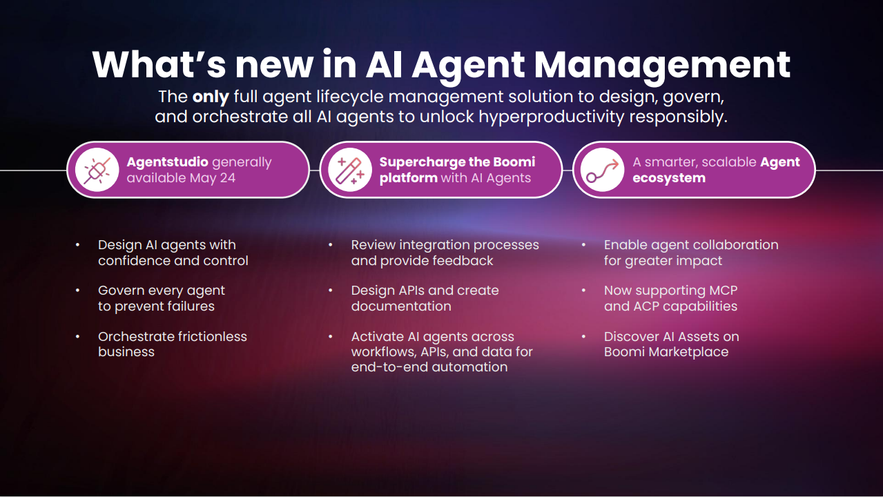 - Beyond iPaaS: Boomi is actively working to shed the "iPaaS" label, positioning itself as a comprehensive enterprise platform for integration, automation, orchestration, API management, data management, and now, AI agent management.